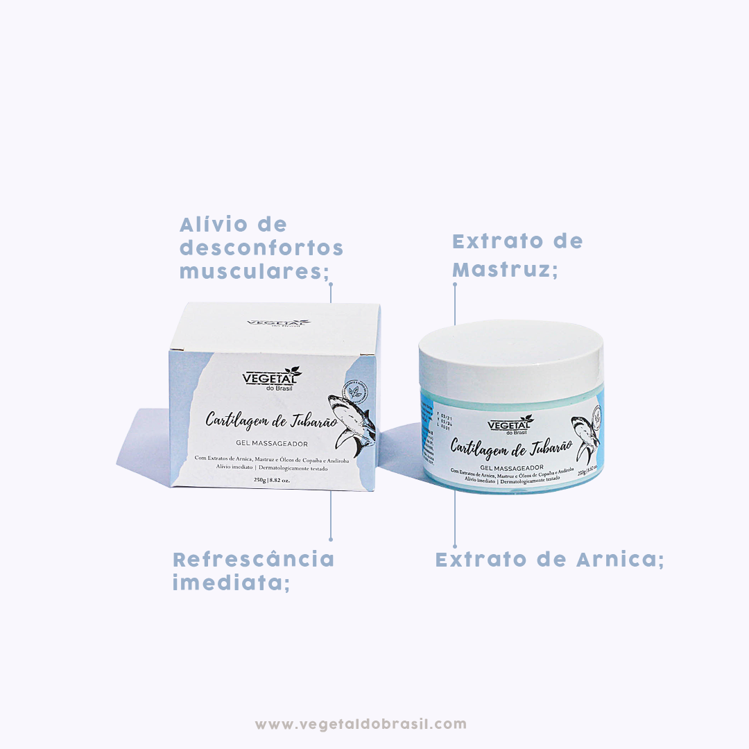 É formulado com Extrato de Arnica, Mastruz e Óleos de Copaíba, Andiroba e a Cartilagem de Tubarão que proporcionam uma refrescância imediata e alívio na sensação de cansaço diário.